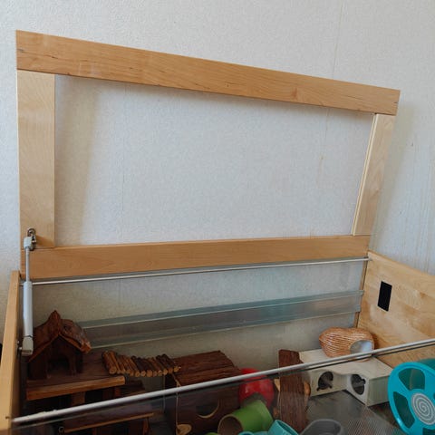 Trähus för smådjur med flera nivåer och gallerdörrar. Inkluderar tillbehör som vattenflaska, stegar, hjul och leksaker i trä och plast. Passar för små husdjur som hamstrar. Material av trä och metallgaller. Målad på utsidan. Spån och sand ingår.