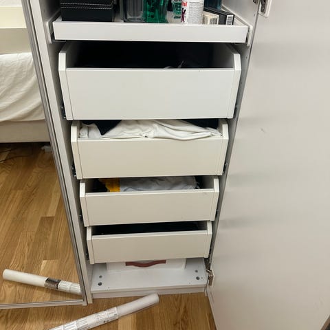 Säljer 1 st IKEA PAX garderobsdel utan lådor. Garderoben är i gott skick och har klädstång samt hyllor enligt bild.