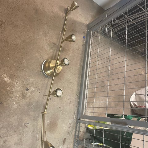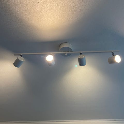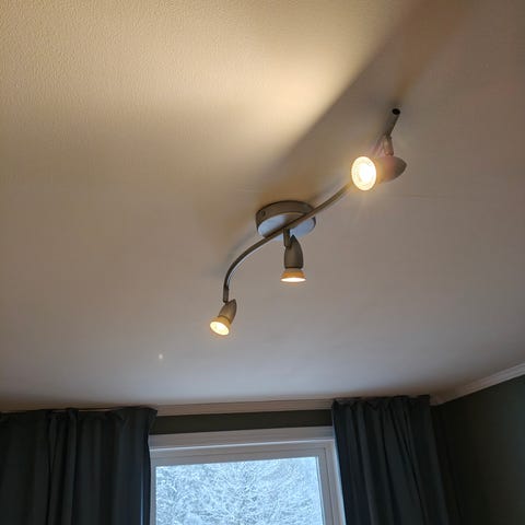 Spotlight från IKEA i rostfritt med 3 spots. Lampor ingår ej. Ca 50 cm jordad kabel sitter i.