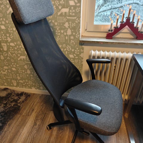 Säljer en IKEA JÄRVFJÄLLET kontorsstol i fint skick. Bekväm och stabil stol med hög rygg, justerbart nackstöd och armstöd. Passar bra för hemmakontor eller kontorsarbete.