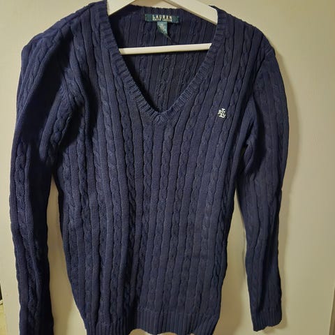 Ralph Lauren stickad tröja i vit färg, storlek M för dam. Tillverkad i bomull med en kabelstickad design och V-ringning. Passar för vardagligt bruk.