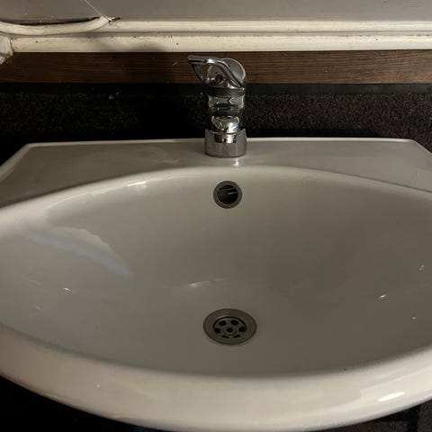 Handfat i vitt porslin med integrerad kran. Passar för badrumsmiljöer och är utformat för väggmontering.