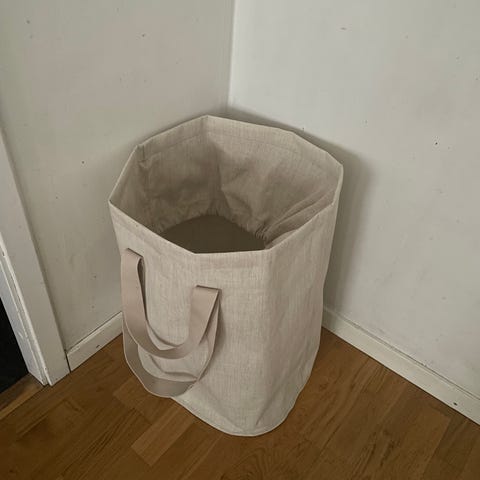 This freestanding laundry bag features a lightweight white metal frame combined with a removable white fabric liner. The structure is stable yet easy to move, with gently angled legs and integrated handles that allow for effortless transport. The fabric bag is clean, intact, and neatly fitted, offering generous capacity for everyday laundry without appearing bulky.