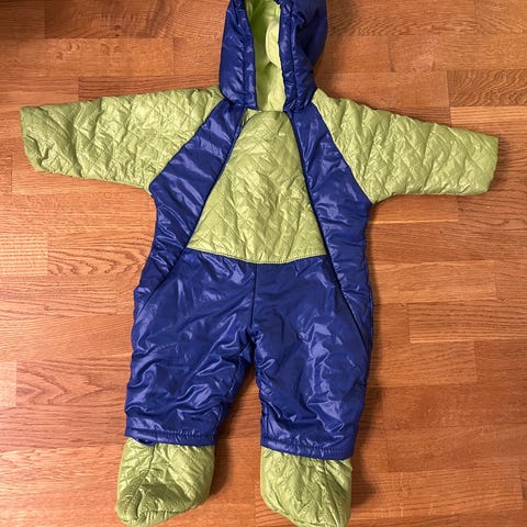 - gul/gröna är typ vindoverall med lätt foder. Ingen storlek finns men har använt som storlek 80-86. Vi har använt under sen vår och tidig höst. Fina hällor.