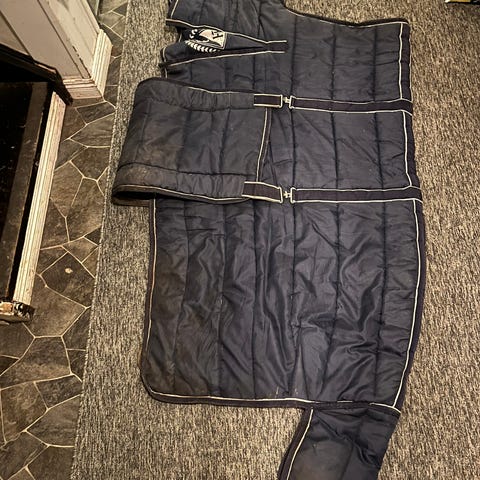 Hästtäcke i mörkblå med röda spännen och remmar för justering. Täcket är vadderat och quiltat för att ge skydd och komfort till hästen. 145 cm