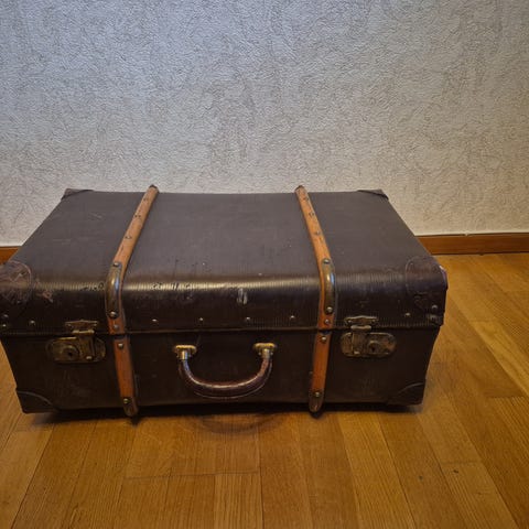 Säljer en gammal koffert i brunt läder. Storlek 67x60x19.