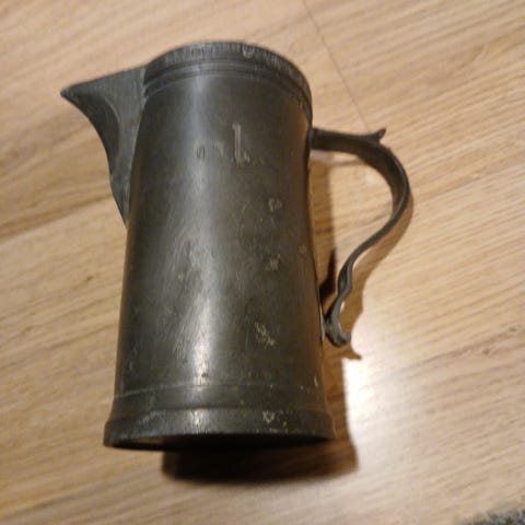 Okänd Märke tennkanna med lock och handtag i metall. Kannan har en klassisk design och är lämpad för servering av drycker. Materialet är tenn, vilket ger den ett robust och traditionellt utseende.