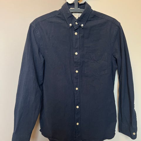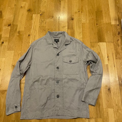En skjorta i våfflad, vävd kvalitet med krage och en ficka på bröstet. Knäpps med knappar hela vägen. Cremevit i färgen. Använd vid ett tillfälle. Nypris 399.