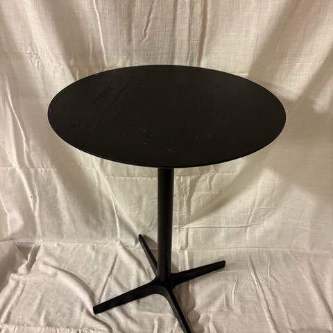 Runt bord med vit bordsskiva och stativ i metall. 70 cm högt. 70 cm diameter. Bordet har stått utomhus på balkong (under tak).