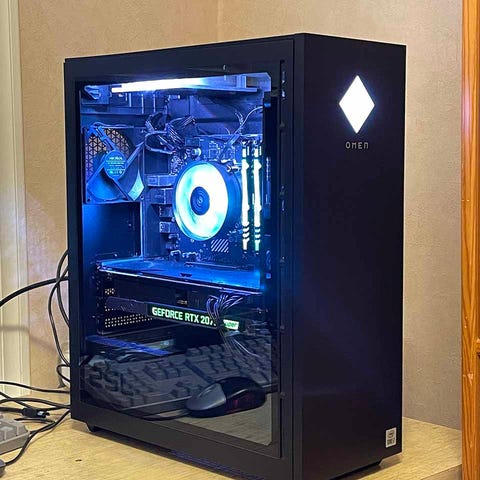 HP Omen stationär gamingdator med RGB-fläktar och svart chassi. Datorn har flera kylfläktar, vattenkylning och anslutningsmöjligheter på både baksidan och framsidan. Lämplig för krävande spel med höga inställningar och annan krävande datoranvändning. Datorn är fabriksåterställd med Windows 11 och redo att användas direkt.