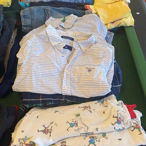 6 shorts, 3 byxor, 15 långärm t shirt, några pyjamasar, 12 tröjor, 8 skjortor, 4 piké
