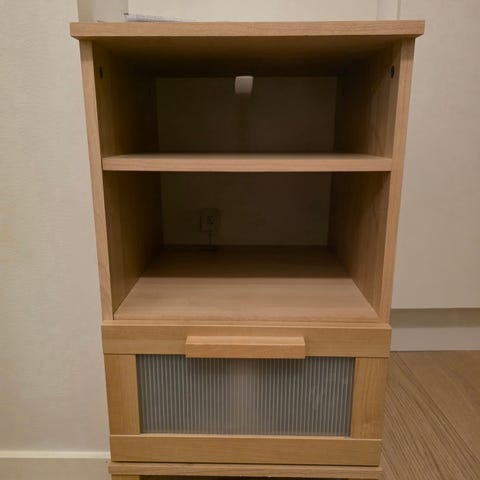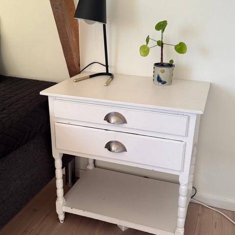 IKEA sängbord i vitt trä med en låda och en öppen hylla. Möbeln är avsedd för användning som nattduksbord bredvid sängen och har en enkel och funktionell design.