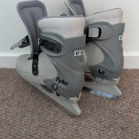 Tyke barnskridskor i storlek 30-33 med grå färg. Skridskorna är avsedda för barn och har justerbara spännen för säker passform.