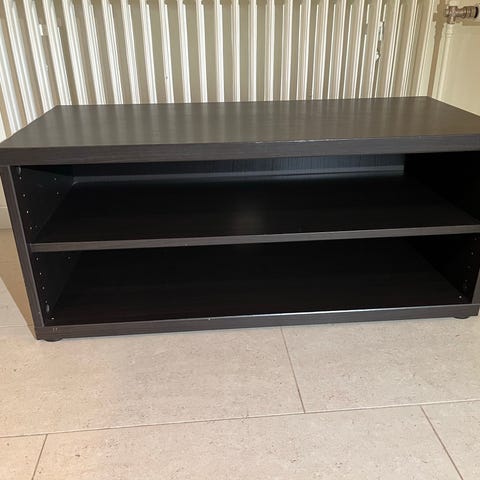 Svartbetsad TV-bänk med två hyllplan. Öppningar i bakväggen för sladdar. Enstaka repa på ovansidan.