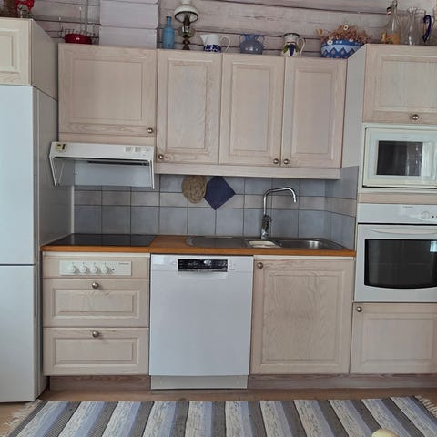 Kök med vita skåp och lådor, bänkskiva i trä . Kökets design inkluderar flera förvaringsutrymmen och överskåp med hyllor.