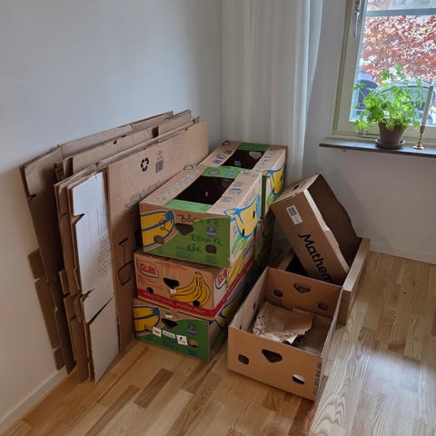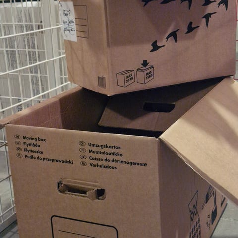 10 st olika flytt lådor i olika storlekar och märken, några från ikea, Jim och fix och Jula. Vissa är helt nya och andra är lite mer slitna