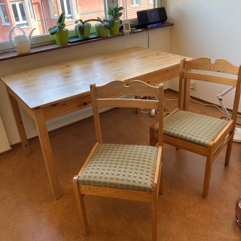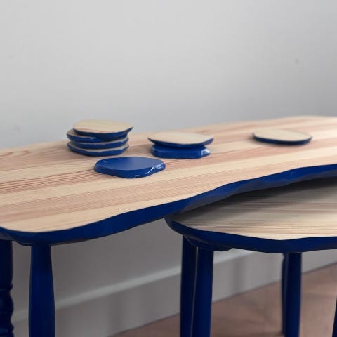 Unika möbler, designade och handgjorda av mig som är möbelsnickare. De är skapade av 100% återbrukade material från furustolar. Lekfullhet och tradition möts i de organiskt formade bordsskivorna och de blanka mörkt gröna underredena som kontrasterar mot furuns livlighet.