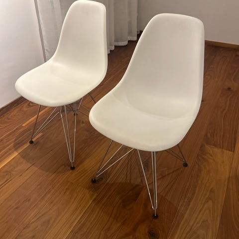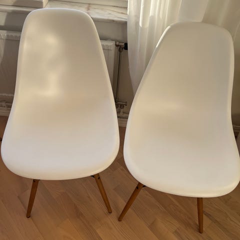 Säljer nu mina fyra mycket fina och stilrena stolar som liknar modellen Eames. Har använt dem som stolar till ett runt vitt matbord, men kan lika gärna användas var än stolar behöves i ens bohag - det är bara kreativiteten som sätter stopp för en!