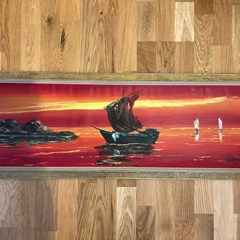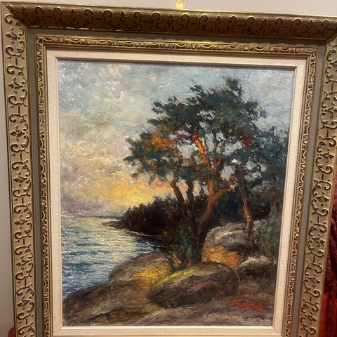 Oljemålning som föreställer ett landskap med ett vattenfall. Målningen är inramad i en träram med dekorativa detaljer. Färgerna i målningen inkluderar blått, vitt och gula toner.