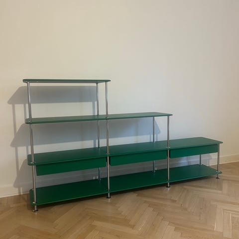 Klassisk Montana hylla med utsågad cirkel i ena hyllan (syns ju ej om man fyller den :-). Saknar sockel samt vägghänge annars i fint skick med några mindre skråmor. Nypris 7 700.