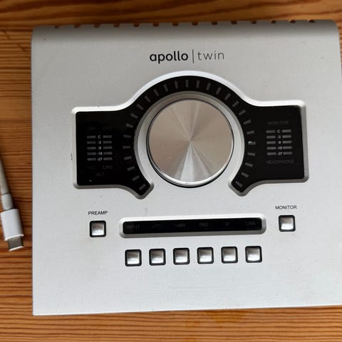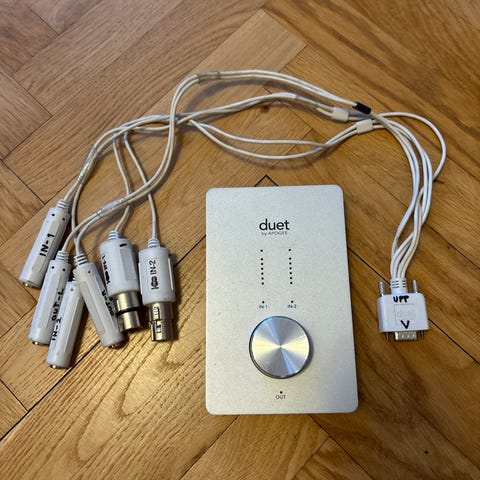 Apogee Duet Ljudinterface med firewire-anslutning i silverfärg. Enheten har flera ingångar och utgångar för ljud, inklusive XLR och 1/4-tums kontakter. Utrustad med en stor ratt för volymkontroll och LED-indikatorer för signalnivå. Passar för professionell ljudinspelning och produktion.