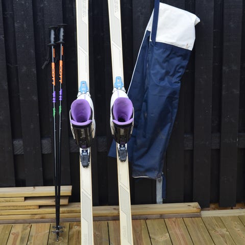 Alpinskidor, längdåkningsskidor, stavar, bindningar.