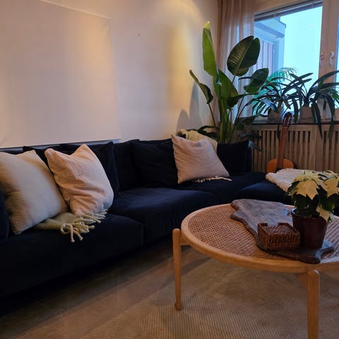 Soffan och pallen har använts i ungefär 3-4 år och är i bra skick. Någon skruv har lossnat inuti ena hörnet på pallen vilket gör att den lyfter lite i det hörnet vid lyft, men inget som märks vid användning och är inte heller synligt.