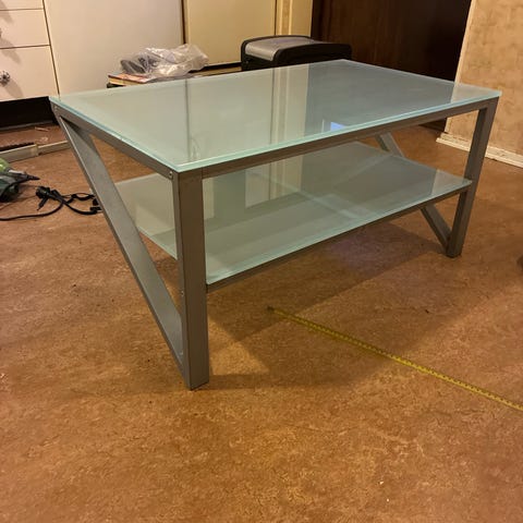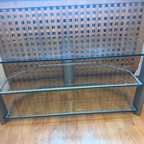 Tevebänk på hjul med tre hyllor i frostat glas. Designen gör att den passar lika bra i ett hörn som mot en vägg. Stilren och enkel design. Genomskinlig, färgen på bilderna kommer delvis från bakgrunden bänken är fotad mot. Funkar förstås även till att ställa annat än bara en TV på!