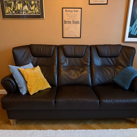 En fin soffa i brunt konstskinn. Skicket är överlag bra men det finns några smämärken.