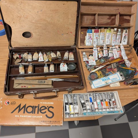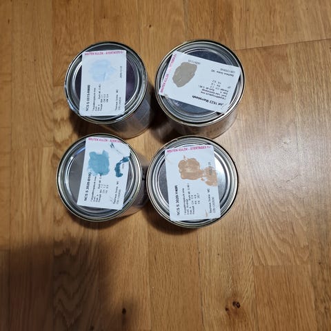 Beige och beige/grå kulörer. Svårt att fånga kulörerna på bild. NCS-koderna på burkarna stämmer inte riktigt.