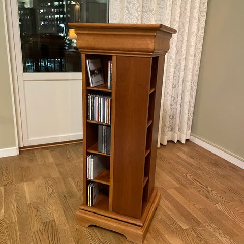 Säljer av två CD-ställ med snurr och rullfunktion som har funnits i familjen sedan tidigt 2000-tal då de inköptes med en tillhörande tv bänk som inte längre finns.