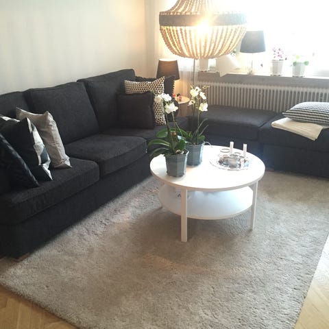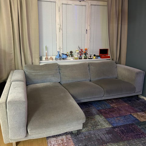 En grå 3-sitssoffa med divan. Längden med divanen är 132 cm och sitthöjden är 40 cm.