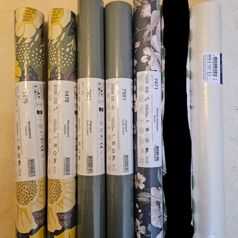 Boråstapeter med blommönster i vitt och blått. En obruten rulle och en påbörjad. 300 kr för båda.