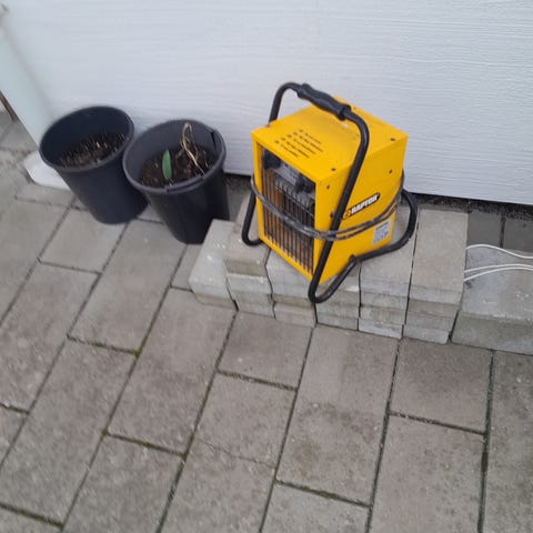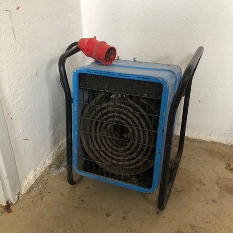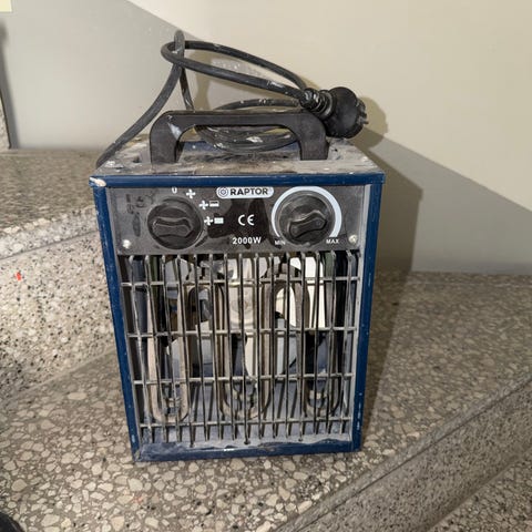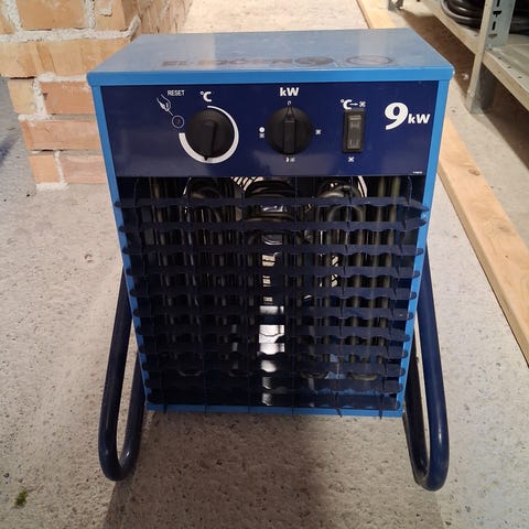 Cotech värmefläkt med blå metallkåpa och handtag. Utrustad med elkabel och strömbrytare. Används för uppvärmning av mindre utrymmen.