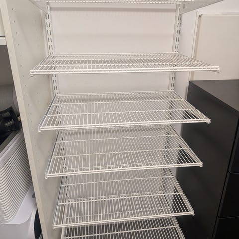 Diverse elfatillbehör. Trådhyllor, trådkorgar, skenor, konsoler.