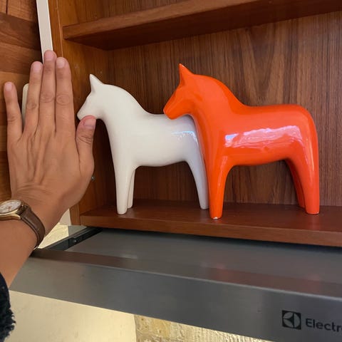 Detta är en klassisk keramikfigur formgiven av Rosa Ljung (1917–1983). Hennes föremål tillverkades främst vid Deco Keramik i Helsingborg och är mycket välkända i svenska hem, särskilt de vita figurerna med de karaktäristiska påklistrade blommorna.