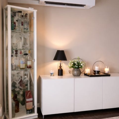 Skrivbordet är diskret integrerat och kan höjas och sänkas, samt döljas helt när arbetsdagen är slut. Resultatet är en ren, harmonisk interiör utan synlig teknik.