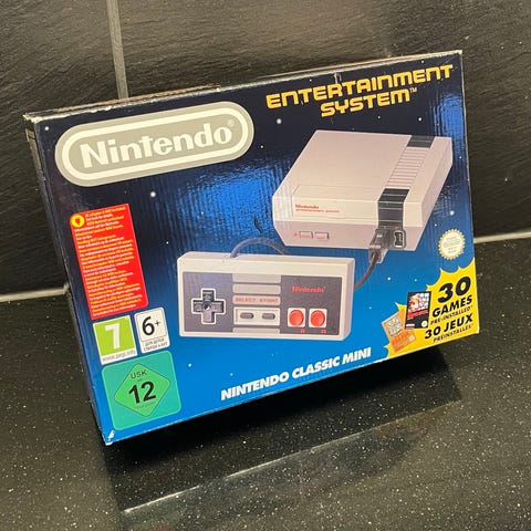 Nintendo Classic Mini Nintendo 8-bit spelkonsol med två kontroller och originalförpackning. Konsolen är en miniatyrversion av den ursprungliga Nintendo Entertainment System (NES) och är kompatibel med flera klassiska spel. Perfekt för retrospel och samlare.
