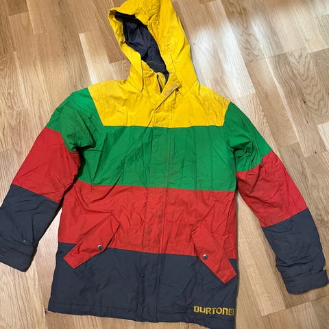Säljer en lättvadderad snowboardjacka som är flerfärgad i svart, grönt, khaki grönt och beige. Storlek är 136-147 cl.