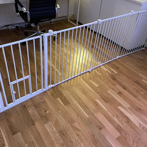 Stilren barngrind i vit metall med fästen. Bredden går att justera. Grinden öppnas utåt eller inåt. Perfekt för trapp.