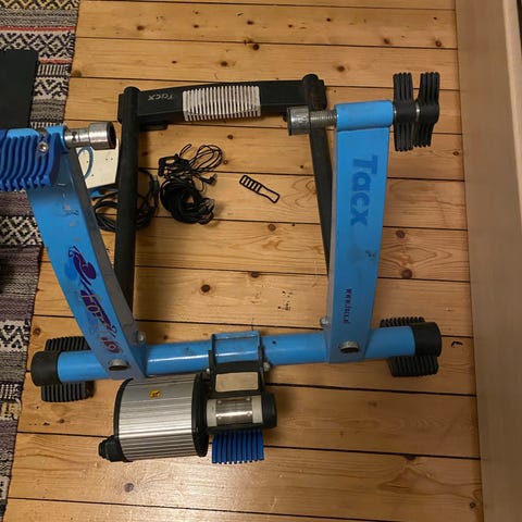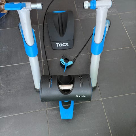 Tacx Flow träningscykel i vit färg. Inkluderar cykelställ, justerbart motstånd och en digital display för träningsdata.