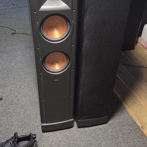Klipsch RF-82 golvhögtalare i svart med dubbla element och basreflexport. Systemet är avsett för hemmabio- och ljudanvändning.