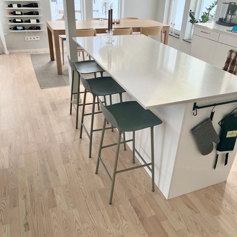 2 st Grå Form barstolar från Normann Copenhagen, med design av Simon Legald. Stilren barstol med stomme av stål och sits av tålig plast. Barstolen har ett bekvämt stöd att vila fötterna på för en högre sittkomfort. Sitthöjder 65 centimeter som passar de flesta köksbänkar, Bredd 42.5, Djup 42,5, Höjd 77 cm. Nypris ca 2 500 kr/st.