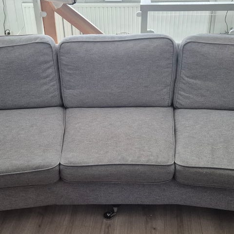En grå 3-sittssoffa i fint skick från Mio. Soffkuddarna är både vändbara samt tvättbara.