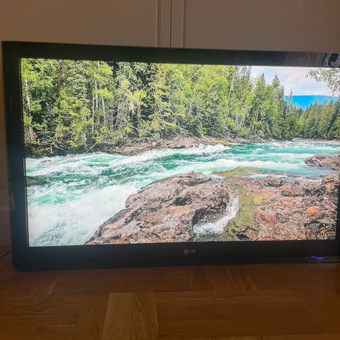 Äldre men bra fungerande teve på glasstativ och med tillhörande fjärrkontroll