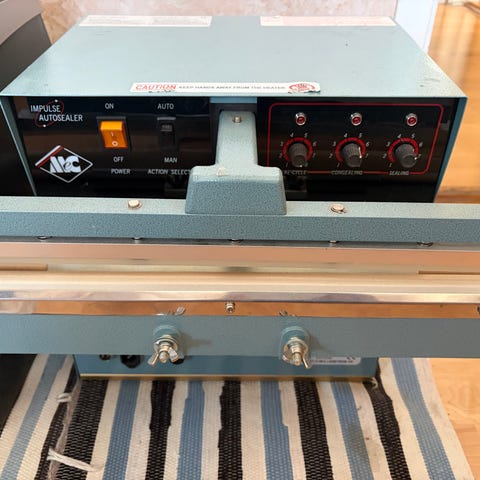 Kegel AJ Modell Zgrzewarka med CE-märkning. Maskinen är avsedd för svetsning och är utrustad med kontrollpanel och handtag för justering. Används inom industriell förpackning och svetsning.