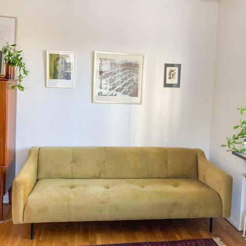 Soffa i speciell modell. Tyg alcantara , ”nopprig” på sittdynan. Det högre armstödet är 83 cm högt och det lägre är 63 cm