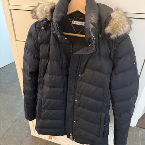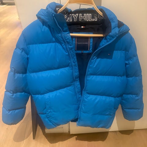 Blå Tommy Hilfiger dunjacka för flicka/dam med huva i fint skick. Storlek 176/16 enligt tillverkaren men passar flicka/dam 150-160 cm.