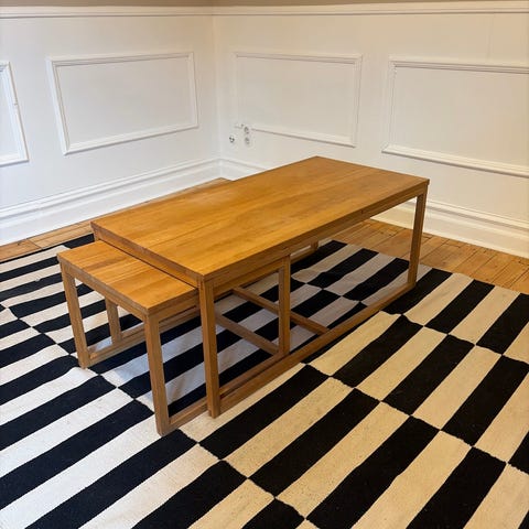 Oval form med förvaringshylla. Nätt och praktisk design och i fint bruksskick. Några små raspor- se detaljbild. Kan troligtvis slipas försiktigt om du störs av dem.
