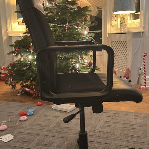 IKEA Kontorsstol med svart sits och ryggstöd, utrustad med hjul för enkel förflyttning. Justerbar höjd med gasliftmekanism. Stommen är i metall med en femstjärnig bas för stabilitet. Passar för kontors- eller arbetsmiljöer.